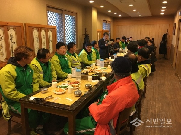 경기 수원시 권선구는 20일 열악한 환경 속에서도 새벽부터 깨끗한 구를 만들기 위해 노력하는 환경미화원 격려를 위한 조찬 간담회를 실시했다. 사진은 이필근 구청장(가운데)이 인사말을 하는 모습.(사진제공=권선구청)