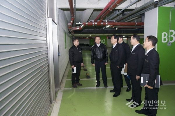 서울 구로소방서는 최근 신도림동 디큐브시티 아파트를 방문해 긴급 화재예방 현장 안전점검을 실시했다. 사진은 장현태 서장(왼쪽 두 번째)을 비롯한 관계자들이 지하주차장을 점검하는 모습.(사진제공=구로소방서)