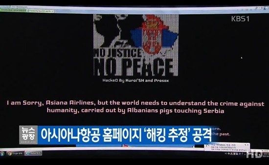 20일 경찰청에 따르면 오늘 새벽 아시아나항공이 해킹을 당해 항공편을 예약, 확인하려는 고객들이 불만을 토로하고 있으며 이날 오전 4시 30분께부터 아시아나항공 홈페이지에는 '정의도 평화도 없다'는 문구와 함께 "아시아나항공에는 유감이지만, 알바니아가 세르비아인들에게 저지른 범죄를 세계가 이해할 필요가 있다"는 해커의 메시지가 영어로 쓰여 있어 더욱 놀라움을 주고 있다.