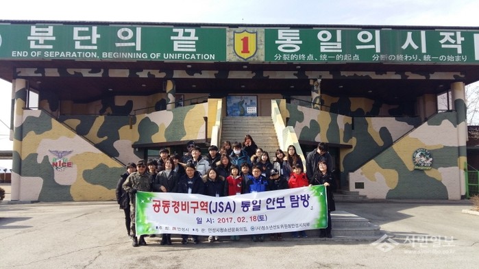경기 안성시청소년문화의집에서는 지난 18일 청소년의 통일의식을 고취시키고자 파주시의 판문점을 견학했다. 사진은 견학에 참여한 청소년들이 기념촬영을 하는 모습.(사진제공=안성시청)
