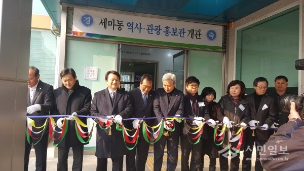 최근 경기 오산시 세마동주민센터와 주민자치회는 곽상욱 시장(왼쪽 다섯번째)과 손정환 시의장(왼쪽 네번째), 도·시의원, 세마동 8개 단체장, 주민차지위원 등이 참석한 가운데 세마동 역사·관광홍보관 개관식을 개최했다.(사진제공=오산시청)
