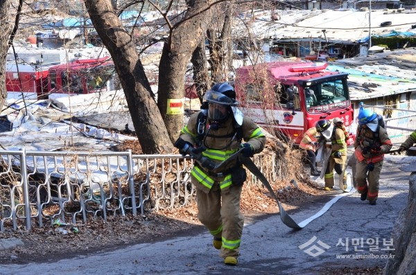 강남소방서는 지난 20일 오후 구룡마을(강남구 소재)에 화재발생을 가상해 화재대응훈련을 실시했다. 사진은 소방공무원들이 차량 진입로 확보 및 수관전개를 진행 중인 모습.(사진제공=강남소방서)