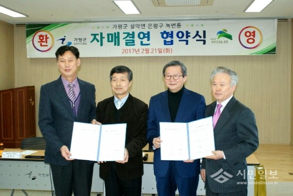경기 가평군 설악면 주민자치위원회는 지난 21일 서울 은평구 녹번동 주민자치위원회와 체육, 관광, 문화, 평생교육, 스포츠 분야 등에서의 상호교류를 목적으로 자매결연을 맺었다. 사진은 관계자들이 결연식 후 기념촬영하는 모습.(사진제공=가평군청)