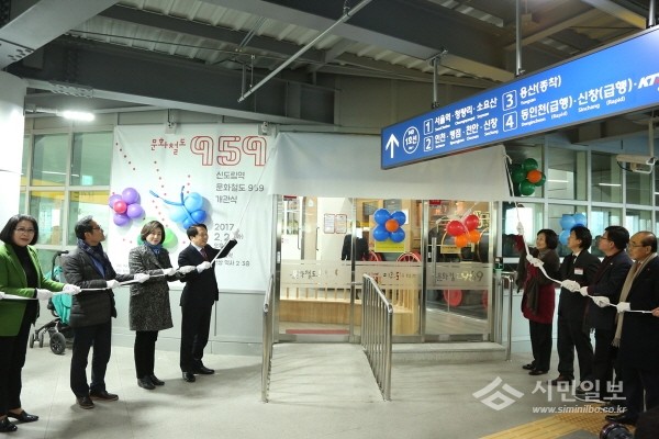 서울 구로구가 지난 21일 신도림 선상역사 에 ‘문화철도 959’를 개관했다. 사진은 개관식에 참석한 이성 구청장(왼쪽 네번째), 박영선 국회의원(오른쪽 네번째) 등이 현판 제막식을 진행하는 모습.(사진제공=구로구청)