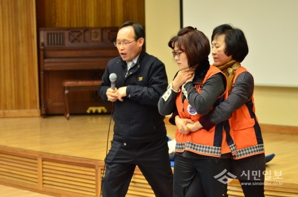 강남소방서는 지난 21일 오후 소방서 및 각 119안전센터에 강남 의용소방대원들이 소집돼 전문성 강화를 위한 소방교육훈련을 실시했다. 사진은 의용소방대원들이 하임리히법 실습을 하는 모습.(사진제공=강남소방서)