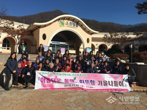 | ▲ '신북면 아름다운동행 가을나들이' 참여자들이 기념촬영을 하고 있다. | ||