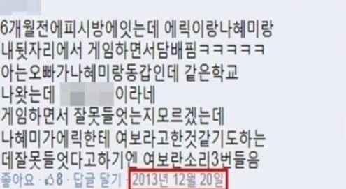 네티즌은 “피씨방에 있는데 에릭과 나혜미가 내 뒷자리에서 게임하면서 담배를 폈다”고 적었다.