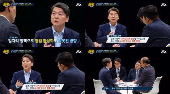 이날 방송에서 안철수 의원은 중소기업 임금 보장을 통한 일자리 창출에 대해 “일자리 정책으로 창업 활성화도 잘못된 방향”이라며 “중소기업이 발전하지 못하게 발목 잡는 주요 요인이 연구 개발 능력”이라고 말했다.