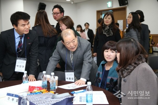 지난 23일 서울 마포구는 서부교육지원청과 함께 마포창업복지관 2층 강당에서 '2017 마포혁신교육지구 100인 원탁토론회'를 개최했다. 사진은 박홍섭 구청장(가운데)이 한 학부모에게 마포교육에 대한 이야기를 드는 모습.(사진제공=마포구청)