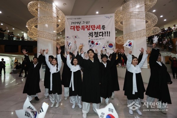 3.1절을 앞두고 최근 서울 송파구 올림픽로 송파구청에서 열린 '1919년 그날, 대한독립만세를 외쳤다' 행사에 참가한 한림연예예술고등학교 학생들이 독립운동 퍼포먼스를 하고 있다.(사진제공=송파구청)