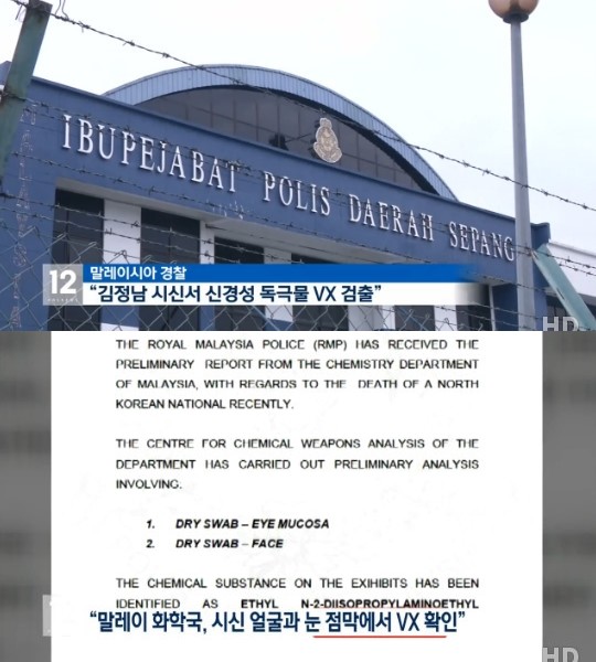 지난 24일 말레이시아 경찰청장은 김정남의 눈점막과 얼굴에서 신경성 독가스인 VX임을 확인했다고 밝혔다.