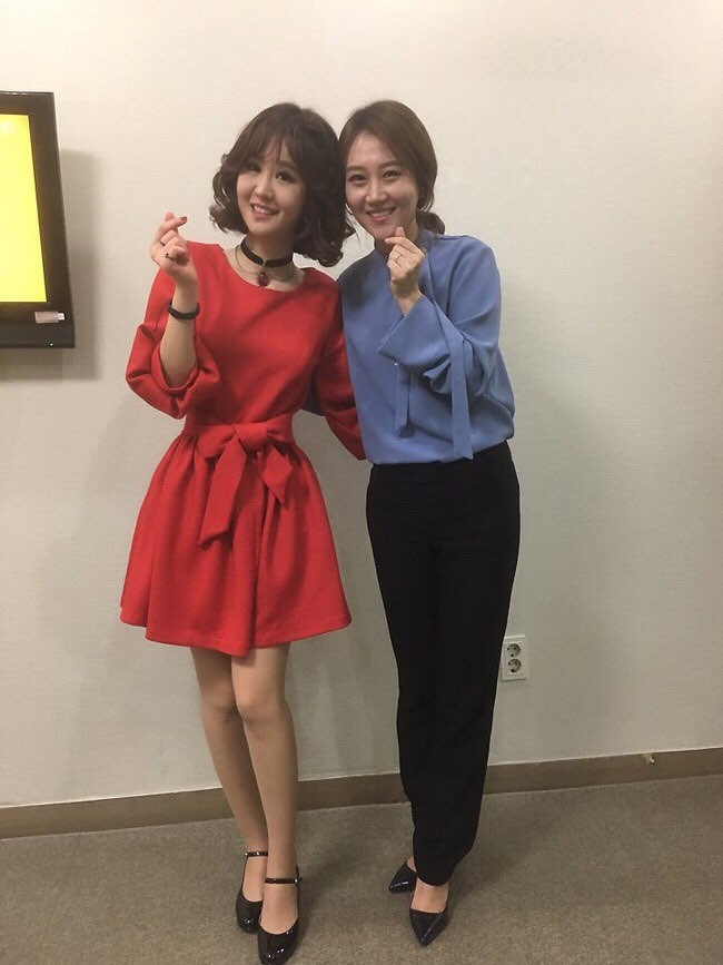 사진 속 윤수현은 방송국 안으로 보여지는 장소에서 레드컬러 원피스를 입고 보색대비되는 블루컬러 블라우스에 블랙팬츠를 걸친 장윤정과 어깨를 감싸안은 모습으로 카메라를 바라보고 있다.