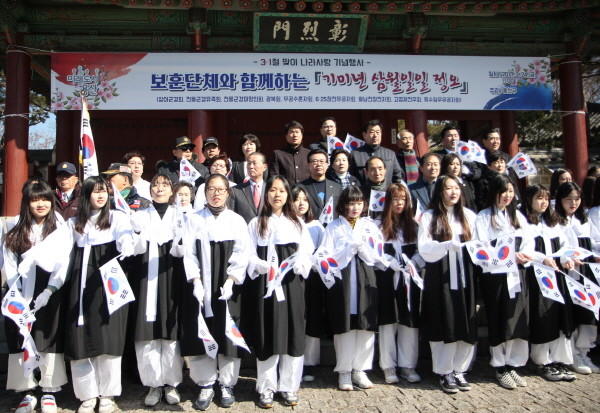지난 24일 서울 용산구 효창원 정문에서 열린 3.1절 맞이 나라사랑 기념행사인 '기미년 삼월일일 정오' 행사에 용산구의회 의원들이 구청장, 보훈단체 관계자, 학생 등과 함께 기념촬영을 하고 있다. (사진제공=용산구의회)