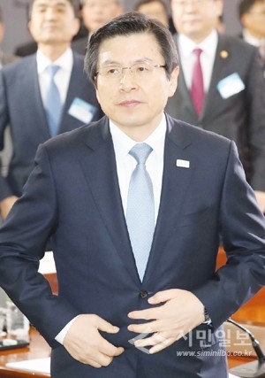 황교안 대통령 권한대행 국무총리가 27일 정부 서울청사에서 열린 무역투자진흥회의에서 국민의례를 하기 위해 자리에서 일어나고 있다.
