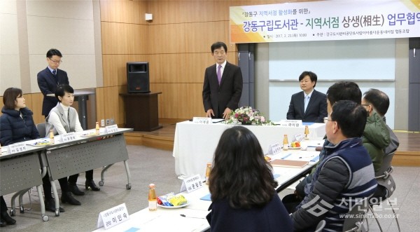 최근 강동구 도시관리공단이 사람이아름다운동네서점 협동조합과 ‘지역서점 활성화를 위한 상생(相生)의 업무협약’을 맺고 지역내 동네서점 살리기에 나섰다. 사진은 양 기관 관계자들이 업무협약을 위해 의견을 나누고 있는 모습.(사진제공=강동구도시관리공단)