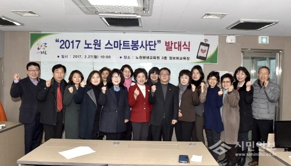 지난 27일 서울 노원구는 평생교육원에서 ‘스마트폰 활용교육’ 전문강사를 도와 수강생의 질문에 1대1로 답변 제공의 역할을 수행하는 ‘스마트봉사단’의 발대식을 개최했다. 사진은 김성환 구청장과 관계자들이 기념촬영을 하는 모습.(사진제공=노원구청)