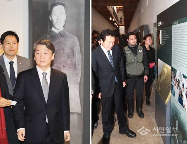 국민의당 안철수 전 대표가 1일 오후 제98주년 3.1절을 맞아 서울 중구 안중근의사기념관을 방문해 전시장을 둘러보고 있다(왼쪽). 손학규 전 민주당 대표가 1일 오전 서울 서대문형무소역사관을 찾아 고(故) 김근태 전 열린우리당 의장 11옥사 앞 김 전 의장의 얼굴 부조를 바라보고 있다.