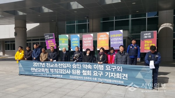 ‘전교조탄압저지! 민주주의 수호! 전남지역공동대책위원회’는 2일 오후 2시 전남도교육청 정문에서 ‘2017 전교조전임자 승인 약속 이행 요구와 전남교육청 부적격인사 임용 철회 요구 기자회견’을 개최했다.