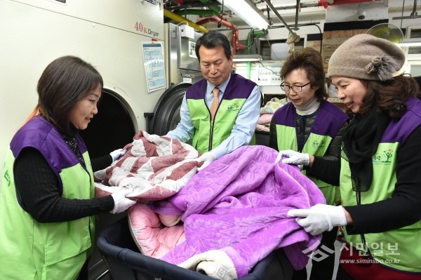 | ▲ 나진구 서울 중랑구청장(가운데)이 ‘새봄맞이 건강100세 이불빨래 프로젝트’의 일환으로 최근 크린토피아 장안지사에서 자원봉사자들과 함께 저소득 홀몸노인 가구 이불빨래 봉사를 실시하고 있다.(사진제공=중랑구청) | ||