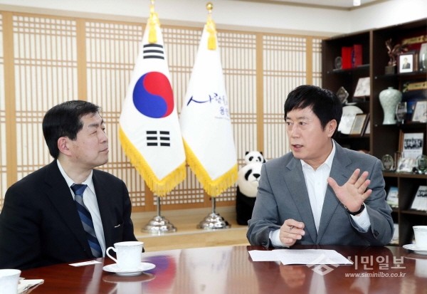 최근 정찬민 용인시장은 창의혁신 교육계의 세계적인 석학으로 알려진 일본 동경대 호리이 히데유키 교수를 접견하고 미래인재 양성에 대한 대담을 나눴다. 사진은 정 시장(오른쪽)과 히데유키 교수(왼쪽)가 이야기를 나누는 모습.(사진제공=용인시청)