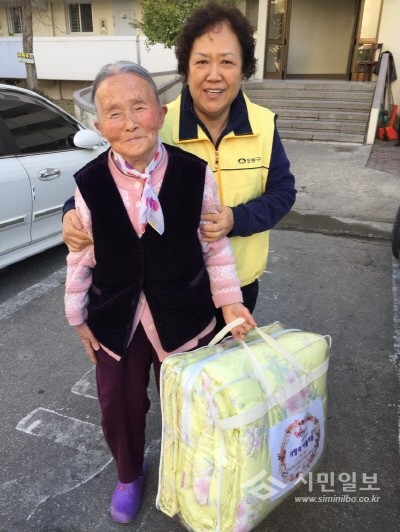 최근 서울 도봉구 창1동 지역사회보장협의체는 지역내 홀몸노인과 한부모가구를 방문해 이불세트 및 학용품과 생필품 등을 넣은 선물상자를 전달했다. 사진은 보장협의체 관계자가 노인에게 이불을 전달한 후 기념촬영을 하는 모습.(사진제공=도봉구청)