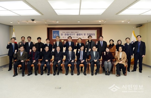 최근 서울 동대문구청에서 민·관이 함께 협의와 토론을 통해 지역사회 문제를 발굴하고 해결하기 위한 ‘민·관 협치 TFT 출범식 및 전체회의’가 열렸다. 사진은 유덕열 구청장(뒷줄 왼쪽 일곱 번째)과 관계자들이 기념 촬영을 하는 모습.(사진제공=동대문구청)