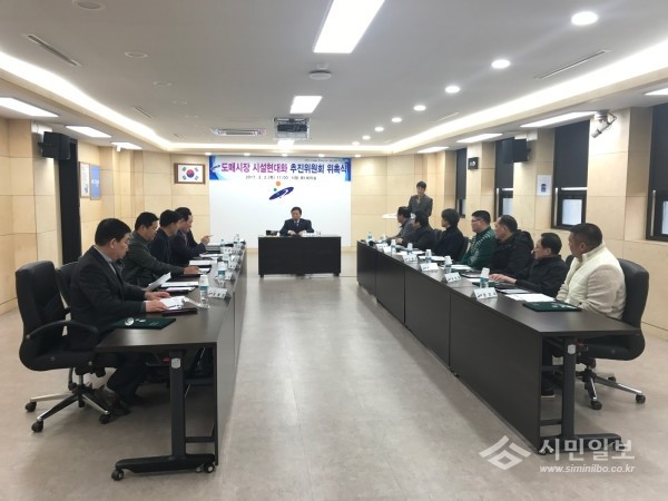 최근 경기 안산시 농수산물도매시장관리사무소가 시청 제1회의실에서 ‘안산시농수산물도매시장 시설현대화사업 추진위원회 위촉식’과 ‘제1회 추진위원회 회의’를 개최했다. 사진은 안산시농수산물도매시장 시설현대화 추진위원회가 회의를 하고 있는 모습.(사진제공=안산시청)