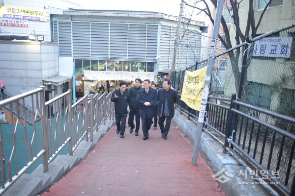 이상훈 경기 수원시 영통구청장은 지난 3일 현장에서 답을 찾는 현장행정을 실천하기 위해 주요 사업현장 로드체킹을 실시했다. 사진은 이 구청장(가운데)이 구매탄시장 진입로개선 공사예정 현장을 둘러보는 모습.(사진제공=수원시청)