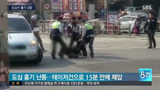 경찰은 4일 오전 서울 도심에서 흉기로 난동을 부리는 남성을 10여분 간 몸싸움을 벌이다 테이저건을 사용해 제압했다.