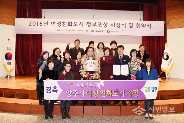 시는 그동안 이 시장 취임 후 여성친화도시를 만들기 위해 성평등정책 추진기반 구축, 여성의 경제·사회 참여 확대, 시민의 안전과 편의 증진, 돌봄에 대한 지역사회 책임강화, 지역사회 여성활동 확산 등을 단계적으로 개선해 왔으며 그 결과 지난해 12월9일 여성가족부로부터 여성친화도시로 지정받았다. 지난 9일에는 ‘함께 미래를 열어가는 여성친화도시 양주 현판제막식 및 비전선포식’을 개최하기도 했다.
