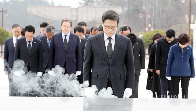 바른정당 정병국 대표가 5일 오전 광주 북구 운정동 국립 5.18민주묘지를 찾아 5월 영령들의 명복을 빌며 묵념하고 있다.