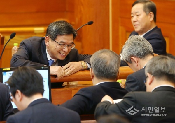 | ▲ 지난 27일 오후 서울 종로구 재동 헌법재판소에서 열린 박근혜 대통령 탄핵심판 최종 변론에 앞서 박 대통령측 대리인단의 이중환 변호사가 관계자들과 대화하고 있다.(사진제공=연합뉴스) | ||