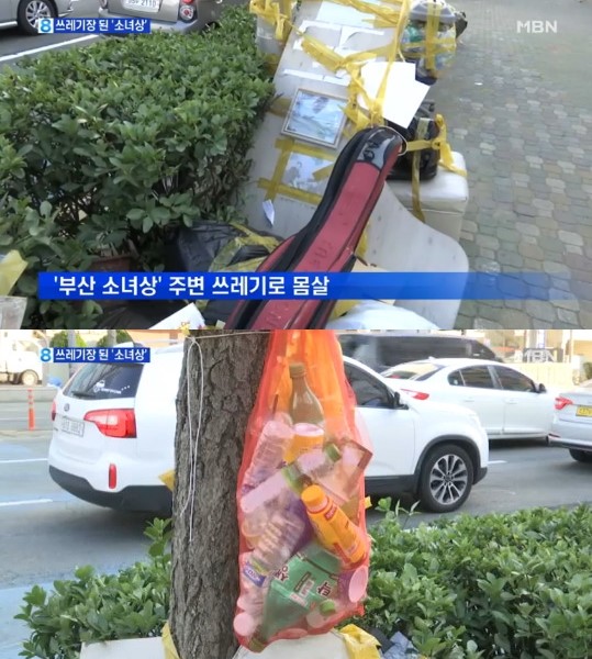 부산 일본 영사관 앞에 설치된 평화의 소녀상이 쓰레기 무단투기로 몸살을 앓고 있다.