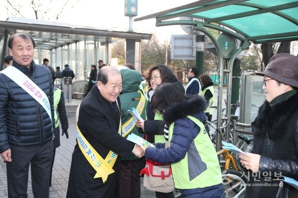 지난 3일 오전 박홍섭 마포구청장(왼쪽 두번째)이 마포구청역(6호선) 일대에서 열린 '제252차 안전점검의 날' 합동캠페인에 참석해 캠페인을 벌이고 있는 안전문화운동추진 마포구협의회 소속단체를 격려하고 있다.(사진제공=마포구청)