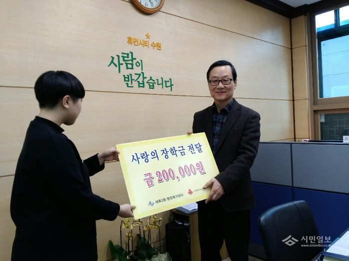 경기 수원시 권선구 세류2동에서는 6일 어려운 환경에서도 꿈을 잃지 않고 열심히 공부하는 지역내 저소득 주민자녀 5명에게 20만원씩 총 100만원의 장학금을 전달했다. 사진은 관계자들이 기념촬영을 하는 모습.(사진제공=권선구청)