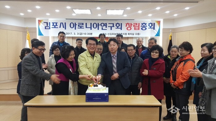 경기 김포시농업기술센터에서는 지난 3일 신김포농협 양촌지점 대강당에서 아로니아를 재배하고 있는 농업인을 대상으로 '김포시아로니아연구회 창립총회'를 개최했다. 사진은 총회에 참여한 관계자들이 케이크 절단식을 하는 모습.(사진제공=김포시청)