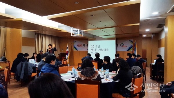 지난 3일 서울 구로구청 3층 창의홀에서 에너지자립마을 협의체 구성원과 환경단체 등을 대상으로 워크숍을 개최했다. 사진은 워크숍 참석자들이 진행자의 진행에 따라 워크숍이 진행되고 있는 모습.(사진제공=구로구청)