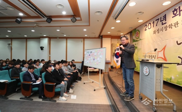 최근 채인석 경기 화성시장(오른쪽)은 서울교통문화교육원에서 열린 '대학생 장학관 입소식 비전특강'을 실시했다. 사진은 채 시장이 장학관 프로그램에 대해 설명하는 모습.(사진제공=화성시청)
