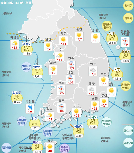 아침 최저기온은 서울 영하 5도, 춘천 영하 7도, 강릉 영하 2도, 대전 영하 3도, 청주 영하 3도, 대구 영하 2도, 광주 영하 1도, 전주 영하 2도, 부산 0도, 제주 3도 등이다.