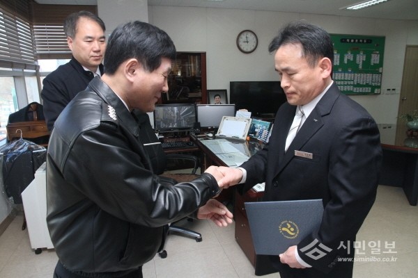 서울 은평소방서는 지난 6일 서장실에서 소방행정 발전에 크게 기여한 직원에게 서울특별시장 표창(이달의 일꾼)을 전수했다. 사진은 심재강 서장(왼쪽)이 이달의 일꾼으로 선정된 정윤화 대원과 악수하는 모습.(사진제공=은평소방서)
