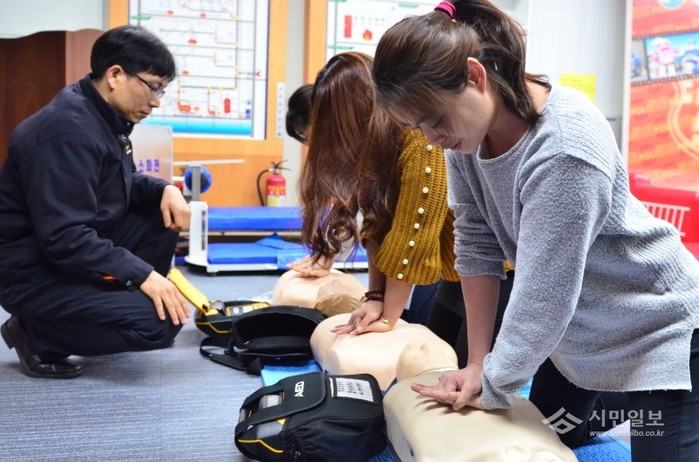 서울 강남소방서는 지난 6일 오후 구립성모어린이집 교사 10여명을 대상으로 심폐소생술 교육을 실시했다. 사진은 참여자들이 자동심장충격기를 사용해 심폐소생술 실습을 하는 모습.(사진제공=강남소방서)