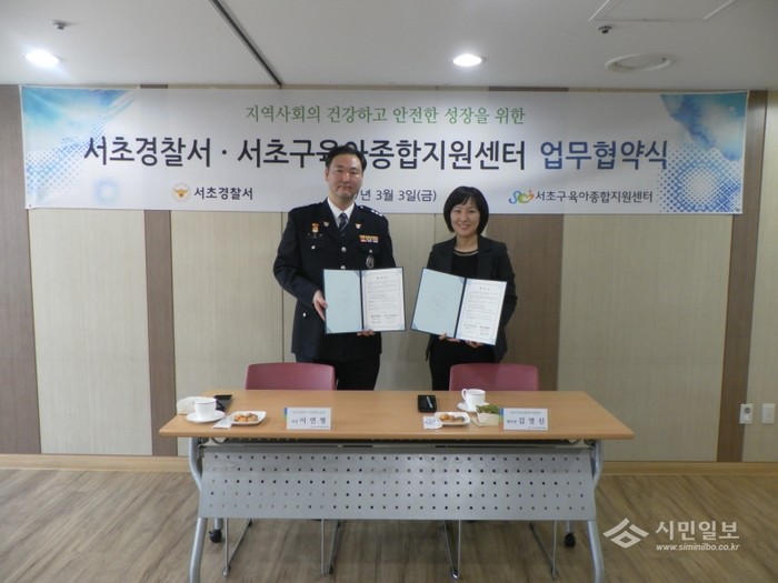 서울 서초구육아종합지원센터는 지난 3일 구 영·유아와 가족, 어린이집의 건강하고 안전한 성장을 지원하기 위해 서초경찰서와의 업무협약(MOU)을 체결했다. 사진은 관계자들이 기념촬영을 하는 모습.