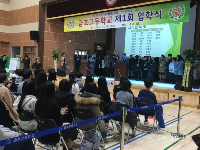 최근 서울 성동구의 신설학교인 금호고등학교는 개교 준비를 마치고 제1회 입학식을 개최했다. 사진은 금호고등학교에서 174명의 신입생과 학부모, 교사, 지역주민이 참석한 가운데 입학식이 진행되고 있는 모습.(사진제공=성동구청)
