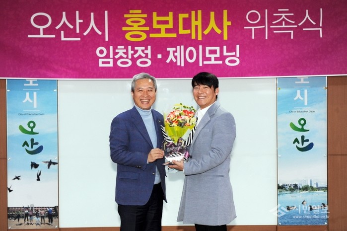 최근 경기 오산시는 앞으로 3년간 지역내 각종 축제·행사 등에서 활동할 ‘오산시 홍보대사’로 가수 겸 배우 임창정씨를 위촉했다. 사진은 곽상욱 오산시장(왼쪽)과 임씨(오른쪽)가 기념촬영을 하는 모습.(사진제공=오산시청)
