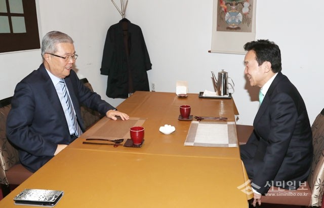 7일 오전 서울 중구 한 음식점에서 김종인(왼쪽) 더불어민주당 전 비대위 대표와 손학규 민주당 전 대표가 만나 이야기를 하고 있다. (사진출처=연합뉴스)