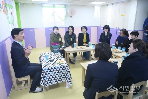 지난 6일 이해식 강동구청장이 어린이 보육관계자들의 다양한 의견을 듣기 위해 최근 문을 연 초롱별 구립어린이집 현장 방문을 실시했다. 사진은 이 구청장(왼쪽)이 보육교사들과 함께 간담회를 열고 이야기를 하고있는 모습.(사진제공=강동구청)