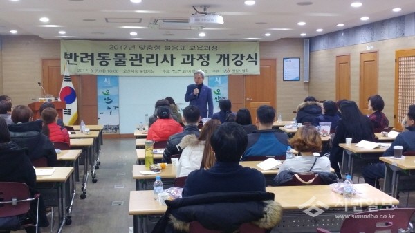 경기 오산시는 지난 7일 시청 2층 물향기실에서 ‘반려동물관리사 과정’ 개강식을 개최했다. 사진은 개강식에 참여한 곽상욱 시장이 교육생들에게 인사말을 하는 모습.(사진제공=오산시청)