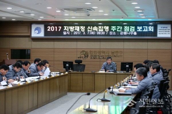 인천 남동구는 지난 7일 구청에서 유병윤 부구청장 주재로 주요 사업부서장 20여명이 참석한 가운데 ‘2017년도 지방재정 신속집행 주간 점검 보고회’를 개최했다. 사진은 유 부구청장(가운데) 및 관계자들이 회의하는 모습.(사진제공=남동구청)
