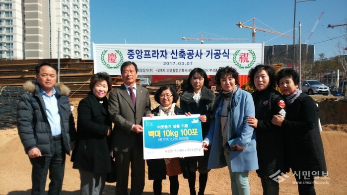 경기 양주시 회천4동 옥정상가주식회사 및 부성종합건설은 지난 7일 상가 기공식 후 불우이웃에게 전달해달라며 양주골쌀 1000kg을 회천4동에 기부했다. 사진은 관계자들이 기념촬영을 하는 모습.(사진제공=양주시청)