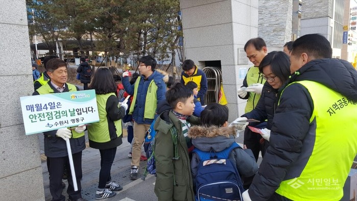 8일 경기 수원시 영통구는 지역내 신풍초등학교 인근에서 유관기관과 '안전점검의 날 합동 캠페인'을 전개했다. 사진은 관계자들이 등교하는 학생들을 대상으로 캠페인을 벌이는 모습.(사진제공=영통구청)